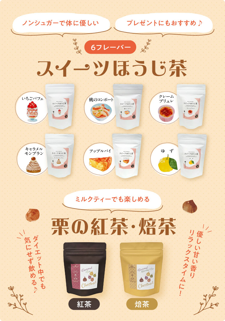 さらに、今年は「スイーツほうじ茶(3g×5p)」6種セットを特別価格でご提供いたします♪