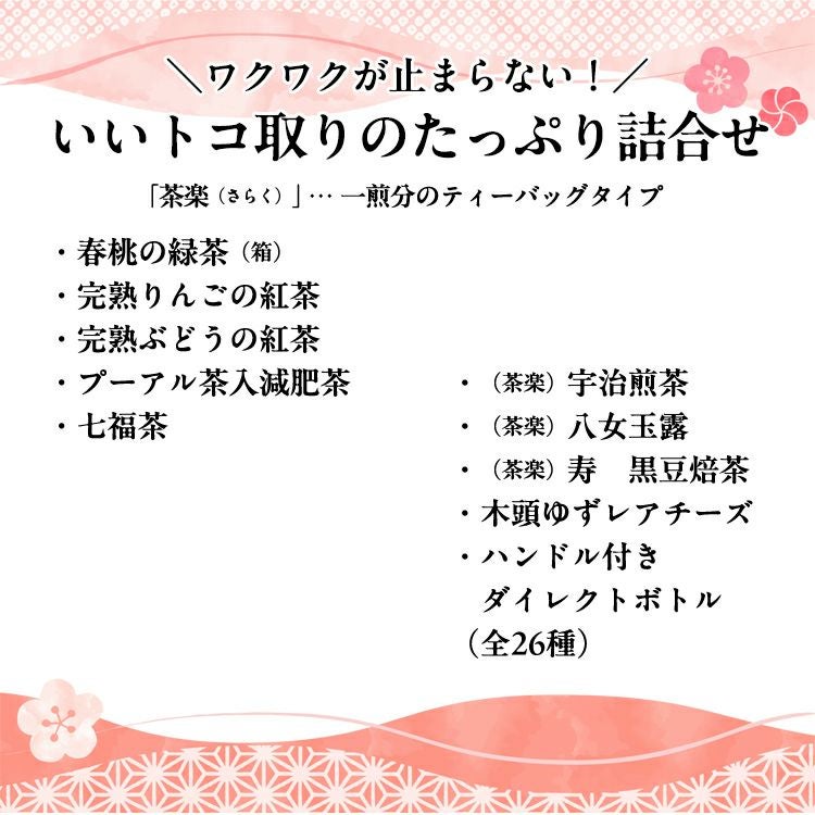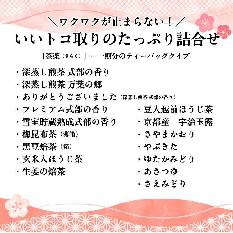 毎日のティータイムが至福のひとときになるちょっと贅沢なお茶の詰合せ。人気のお煎茶や、季節限定のフレーバーティーなど、たっぷり入っています。お茶の宝箱のような福箱です。