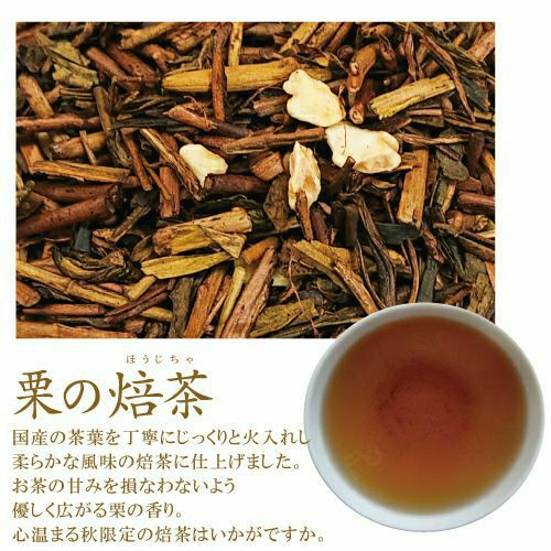 香ばしく、深い味わいが魅力の焙茶に、秋の訪れを感じる栗の香りが口いっぱいに広がる季節限定の焙茶。 忙しい朝にも、ほっとしたい夜にも、旬の甘香ばしい香りを体いっぱいに楽しむことで、心にも栄養を与えるリラックスタイムになるはずです。