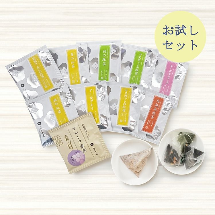 【セット内容】 (茶楽)完熟りんごの紅茶 3g×1p (茶楽)苺の紅茶3g×1p (茶楽)桃の紅茶3g×1p (茶楽)マスカットの紅茶3g×1p (茶楽)アールグレイ3g×1p (茶楽)マスカットの緑茶2g×1p (茶楽)桃の緑茶2g×1p (茶楽)フルーツ麦茶ぶどう5g×1p (茶楽)ルイボスピーチ3g×1p (茶楽)【国産】白桃烏龍茶2.5g×1p