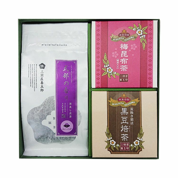 【セット内容】 式部の香り(5gx16p) 梅昆布茶(2gx15p) 黒豆焙茶(3gx5p) ※箱入れ、包装込のギフトです。