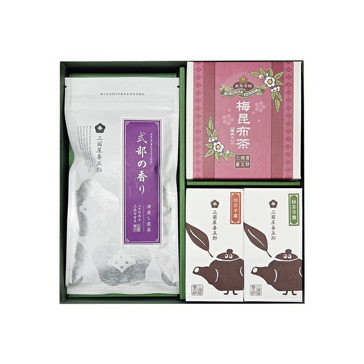 【セット内容】 式部の香り100g(平袋) 梅昆布茶2g×15p(小薄箱) 緑茶羊羹190g 焙茶羊羹190g 4貼箱 ※箱入れ、包装込の商品です。