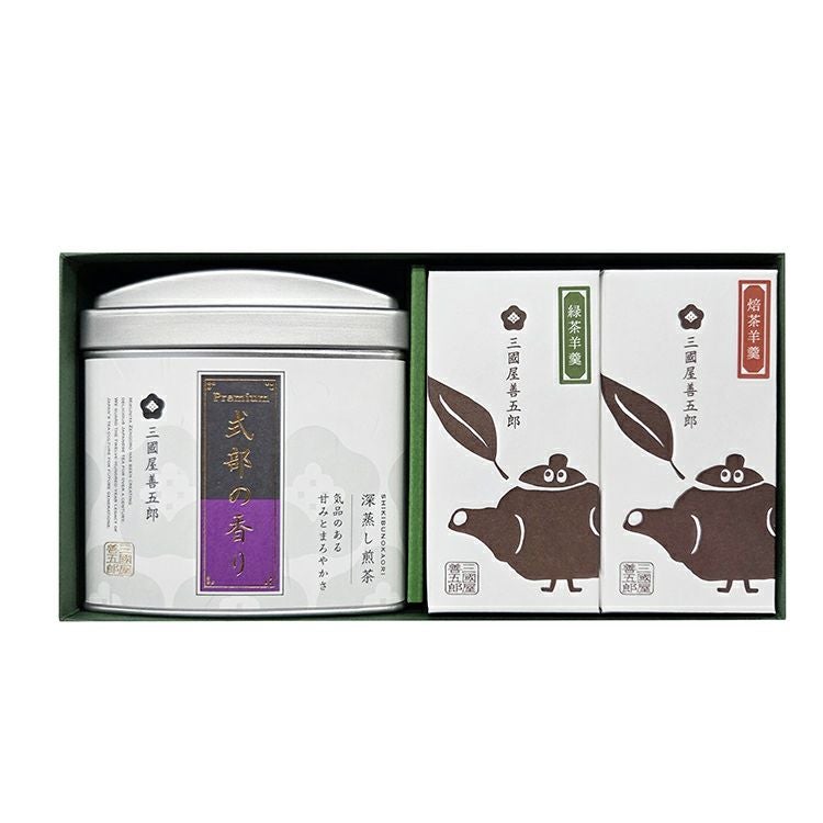 【セット内容】 プレミアム式部の香り 60g(大缶) 緑茶羊羹 190g 焙茶羊羹 190g ※箱入れ、包装込の商品です。