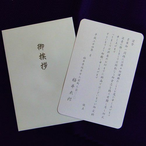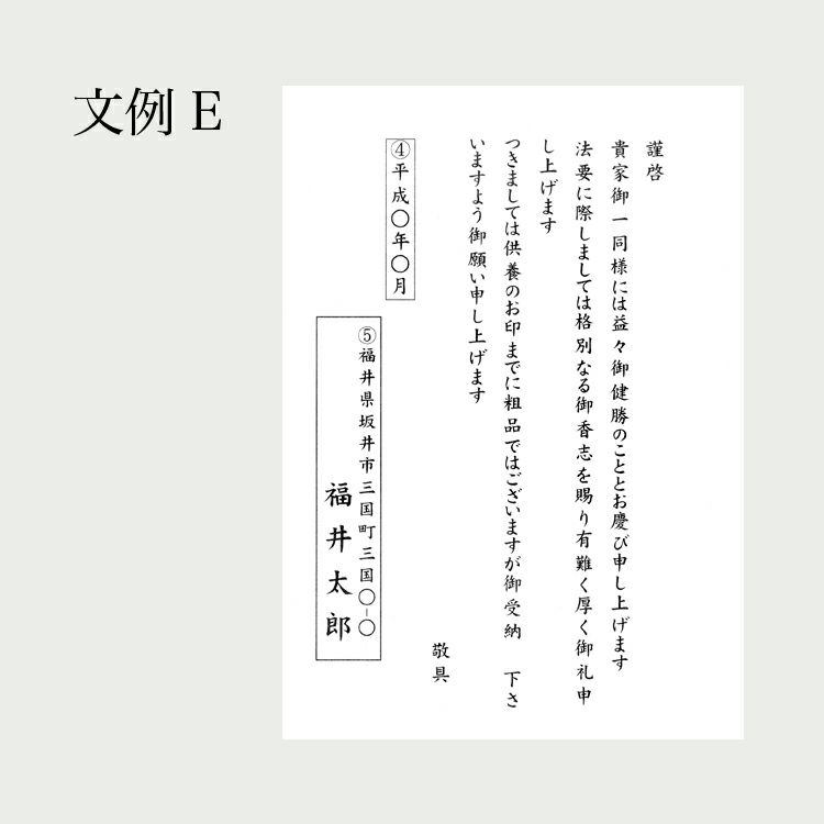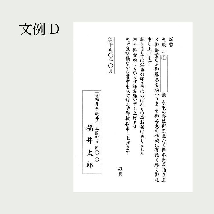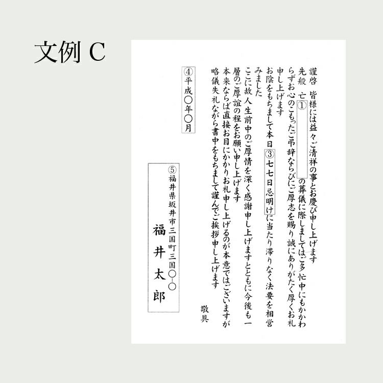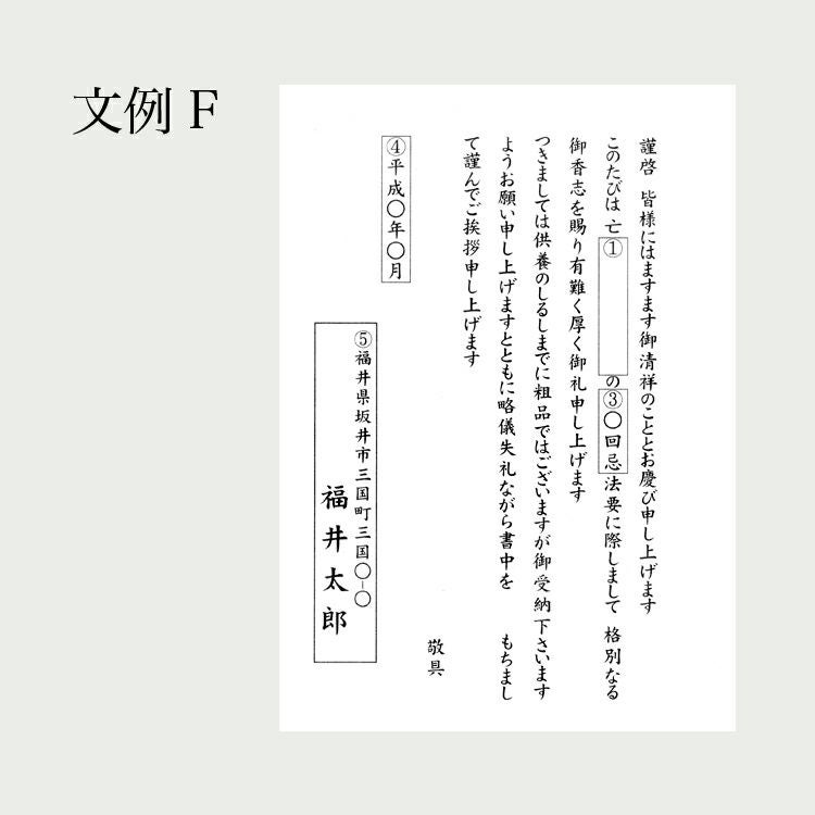 法事用のご挨拶状をご用意いたしております。 文例よりご希望の文例をお選びいただき、必要事項をご記入ください。 法要お礼状のご注文について 1.故人のお名前の記入例 亡○(間柄)○○(お名前) (例)亡 妻 花子 ※間柄の記載が必要ない場合は「備考」欄に「間柄記載なし」とご記入ください 4.挨拶状発送月について 月の変わり目は、送り先の方が受取る月をご記入ください