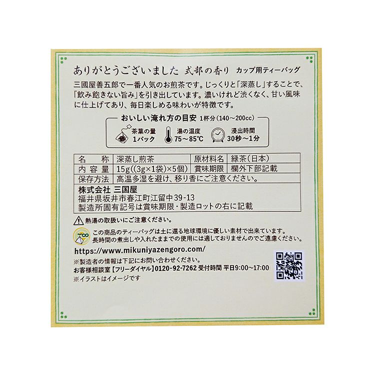 賞味期限等の商品情報は箱裏面に記載しております。お茶の個包装には記載はございません。 |