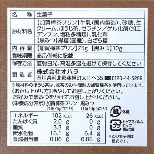 【加賀棒茶プリン】牛乳(国内製造)、砂糖、生クリーム、、ほうじ茶、ゼラチン/ゲル化剤(加工デンプン、増粘多糖類)、乳化剤