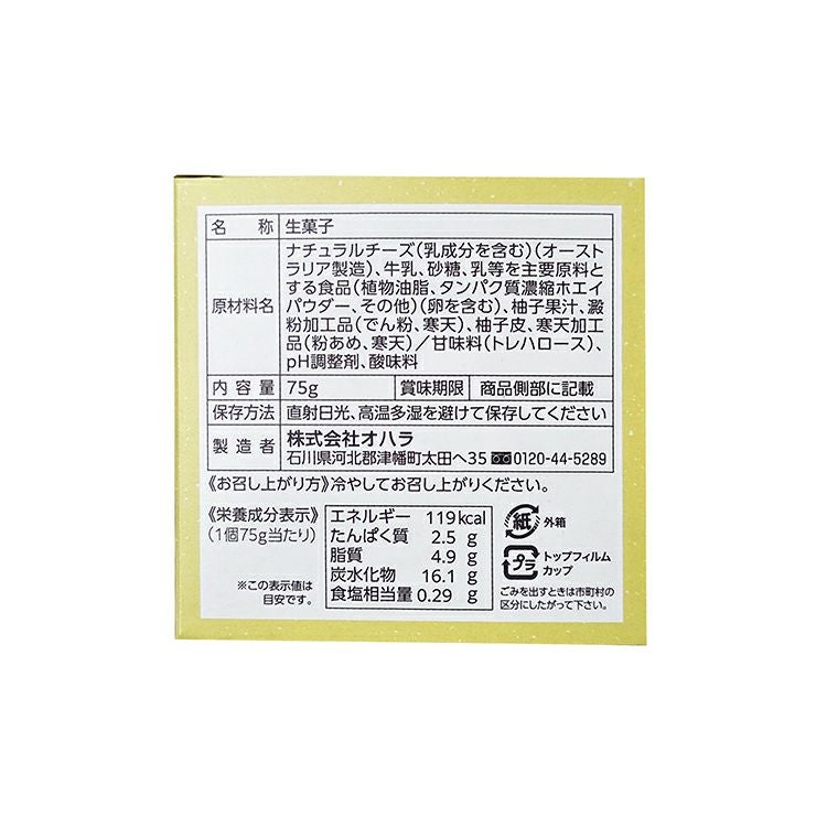 ナチュラルチーズ(乳成分を含む)(オーストラリア製造)、牛乳、砂糖、乳等を主要原料とする食品(植物油脂、タンパク質濃縮ホエイパウダー、その他)(卵を含む)、柚子果汁、澱粉加工品(でん粉、寒天)、柚子皮、寒天加工品(粉あめ、寒天)/甘味料(トレハロース)、pH調整剤、酸味料