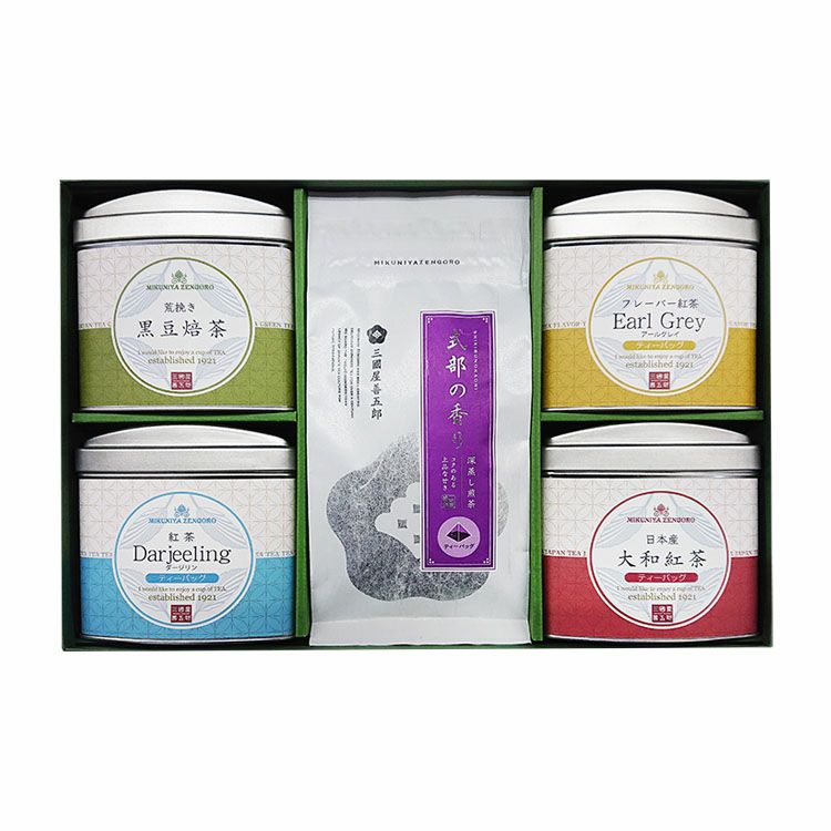 【セット内容】 【荒挽き】黒豆焙茶 40g(大缶) ダージリン ティーバッグ3g×10p(大缶) 式部の香り 5g×16p(袋) アールグレイ ティーバッグ3g×10p(大缶) 【日本産】大和紅茶 ティーバッグ3g×10p(大缶) ※箱入れ、包装込の商品です。