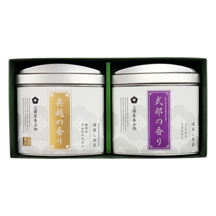 若く柔らかな新芽を使用した、フレッシュな香りと上質な煎茶ならではの甘さがお楽しみいただける「奥越の香り」。 1番人気、余韻の残る甘みとコクが特徴の「式部の香り」。 三國屋善五郎が自信を持っておすすめする人気のギフトセットです。 【セット内容】 奥越の香り(60g) 式部の香り(60g) ※箱入れ、包装込の商品です。