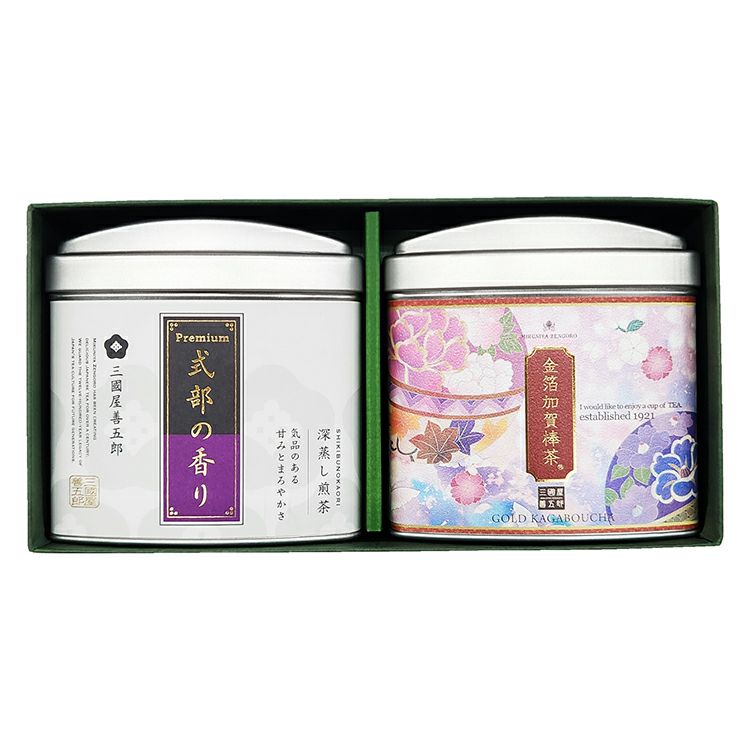 【セット内容】 プレミアム式部の香り 60g (大缶) 金箔加賀棒茶 40g (大缶) ※箱入れ、包装込の商品です。
