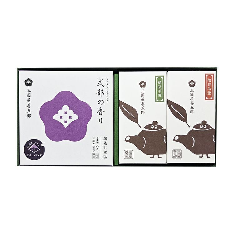 【セット内容】 式部の香り 3g×7p(薄箱) 緑茶羊羹 190g 焙茶羊羹 190g 2缶貼箱 ※箱入れ、包装込の商品です。