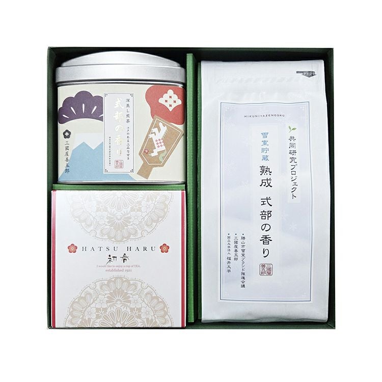 【セット内容】 干支式部の香り 60g 初春(金箔入煎茶) 3g×5p 雪室貯蔵熟成式部の香り3g×12p ※箱入れ、包装込の商品です。