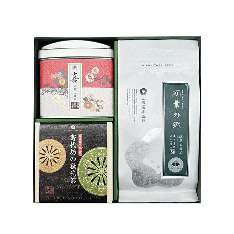 三國屋善五郎オリジナルのお煎茶「式部の香り」の〈喜〉パッケージと、式部の香りに次ぐ人気茶「万葉の郷」、限定茶「寄代坊の穂先茶」のセット。『寄代坊の穂先茶 』は鎌倉幕府に献上されていた由緒あるお茶で、日本緑茶発祥の地と言われている「宇治田原大福谷」で栽培された茶葉です。宇治茶特有の非常に香り高い味わいをお楽しみください。個性の違う3種を詰め合わせているので、お茶好きな方にも喜ばれるギフトセットです。