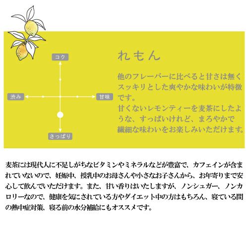 芳醇なフルーティな香りとスッキリとした爽やかな甘みが口の中にひろがり、まるでフルーツを食べたような後味。麦茶の香ばしさも相性◎