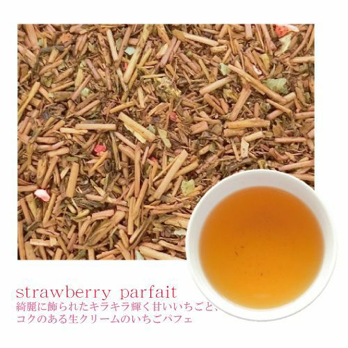 綺麗に飾られたキラキラ輝く甘いいちごと、コクのある生クリームのいちごパフェの香りをイメージして作ったほうじ茶です。 甘いものが食べたい!そんなとき、スイーツ感覚でお飲みいただけるお茶です。